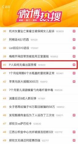 • 微博话题 #P 人如何无痛出国赏樱 阅读量超 1.4 亿,互动量 12.1 万 +,登上微博热搜第 40 位,在榜 1 小时;
