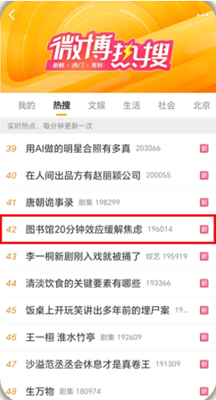 • #图书馆 20 分钟效应缓解焦虑 #热搜最高位 42,累计在榜时长1小时38分,主榜时长20分钟;