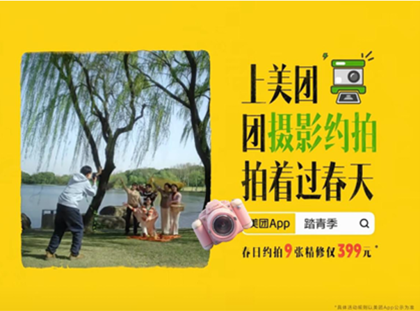 美团围绕春季踏青场景,用“上美团搜索踏青季”作为统一利益点,通过小红书、抖音、视频号三大平台联动 16 位达人线下打卡+线上种草,配合攻略海报、病毒表情包等多元物料,辐射多圈层用户,强化“过节上美团”的心智。